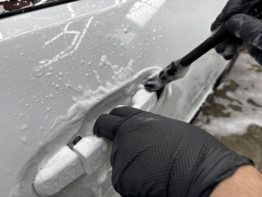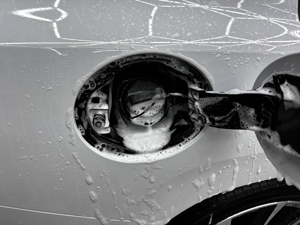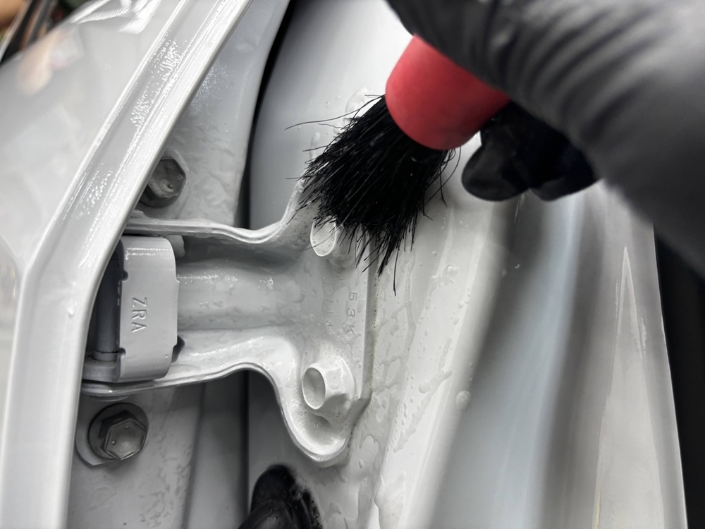 給油口やドアハンドルの隙間、ヒンジ部など普段洗浄しない部分もしっかりアプローチします