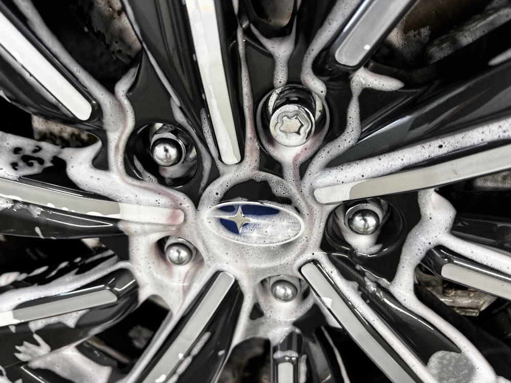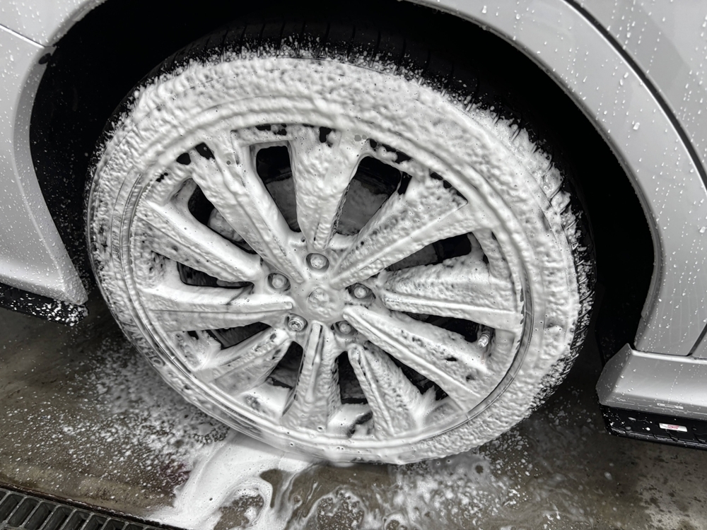ブレーキダストクリーナーも用いつつ、傷が入りにくくなるよう洗剤を泡状にして洗浄します。