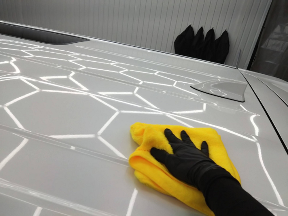 今回シルバーコースになりますので「G-POWER塗布→スチーム→拭き上げ」を3工程おこない、その上に別のコーティング剤を塗布することで計19層のガラス被膜を形成。