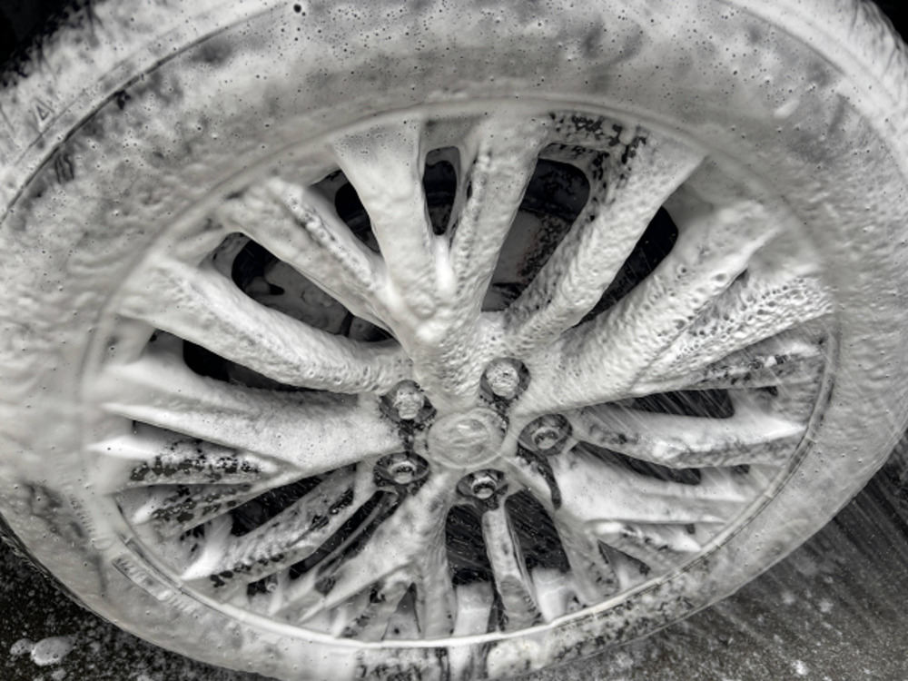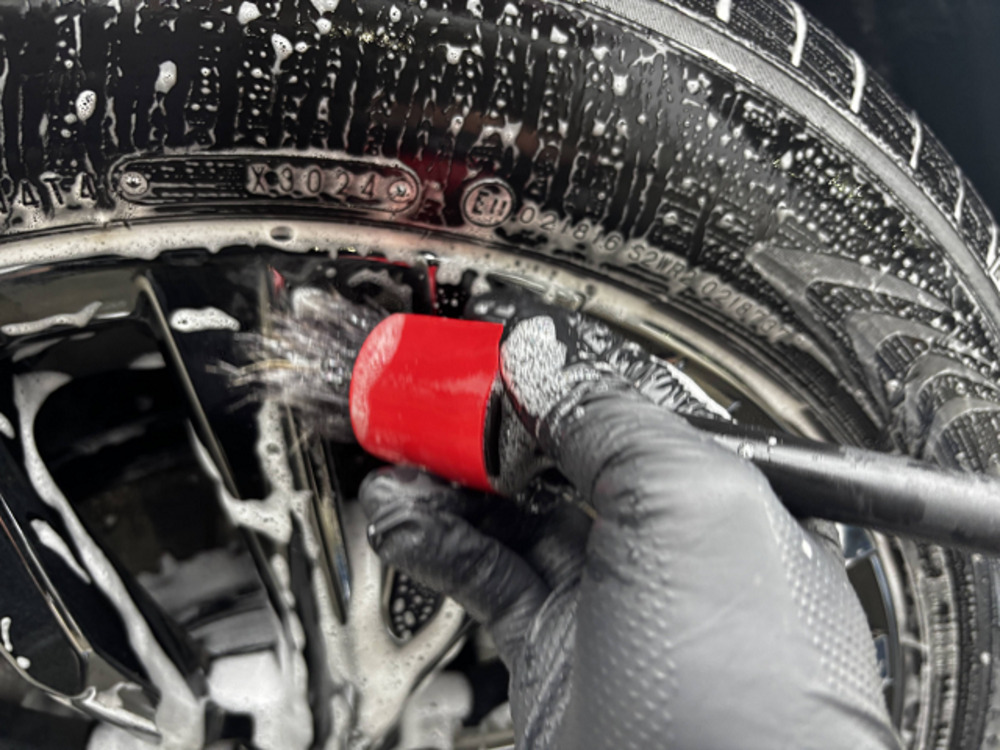フォームガンを使用し、ホイールに満遍なく泡を吹き付けていきます。