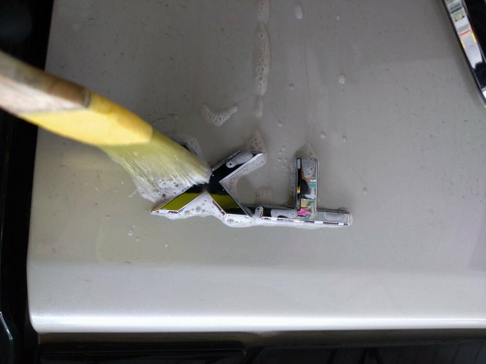 水シミ、水垢汚れには酸性のケミカルを使用してヒンジなどの油汚れにはアルカリ洗剤を使いました。