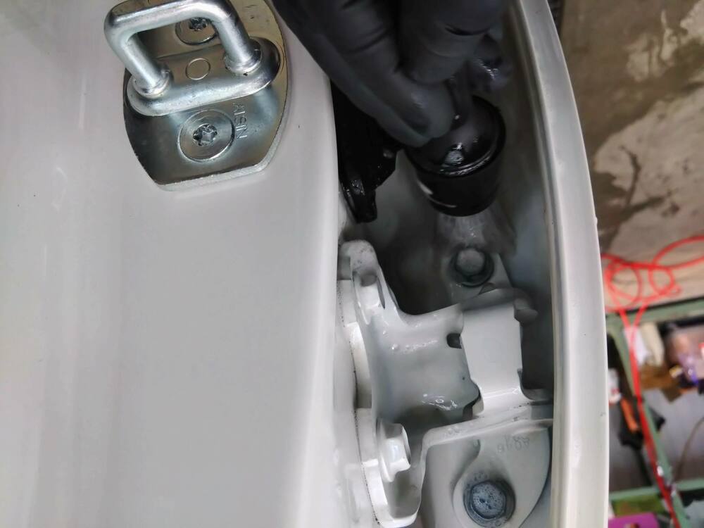 タイヤ周りとボディの洗車を済ませて再度お車の状態をチェックところヒンジの油汚れやメッキパーツのくすみや水垢も確認できましたので根気強く進めていきます。
