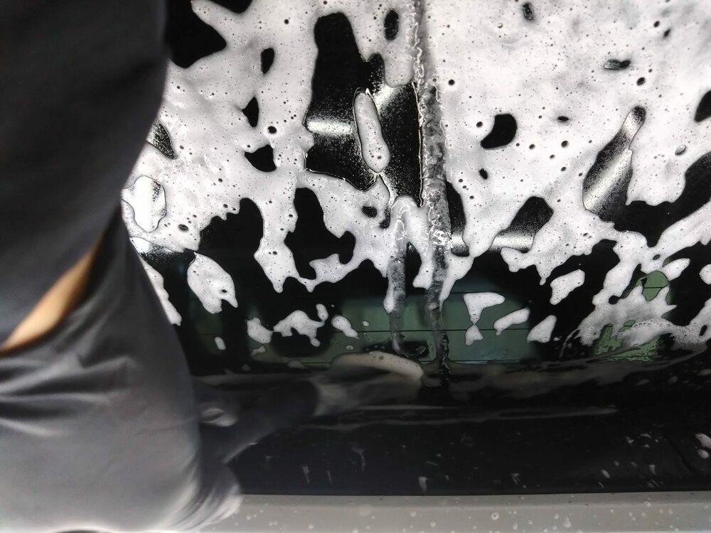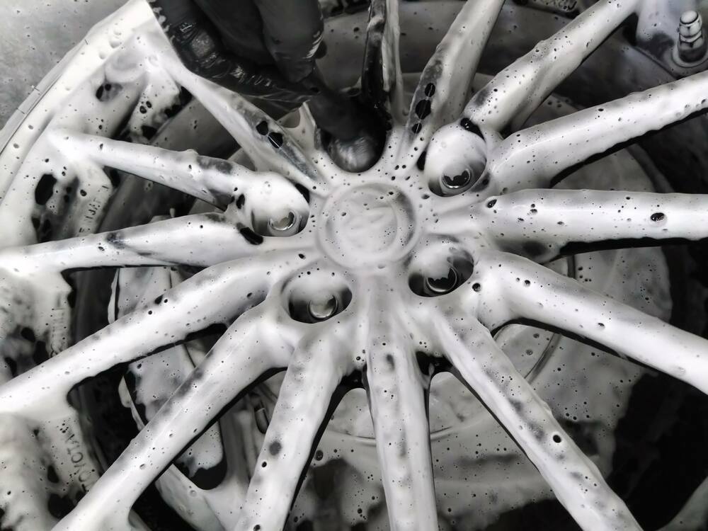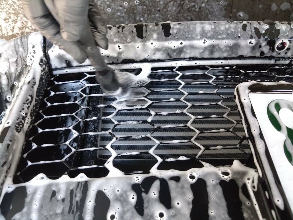 高圧洗浄機で予洗い後、フォームガンを使用しミット洗車を行ってから細かい箇所にブラシを入れます。