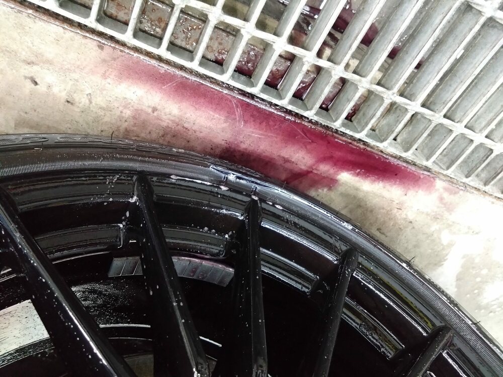 高圧洗浄機で予洗いを入念に行ってから洗剤で洗浄してからブレーキダストクリーナーを塗布。