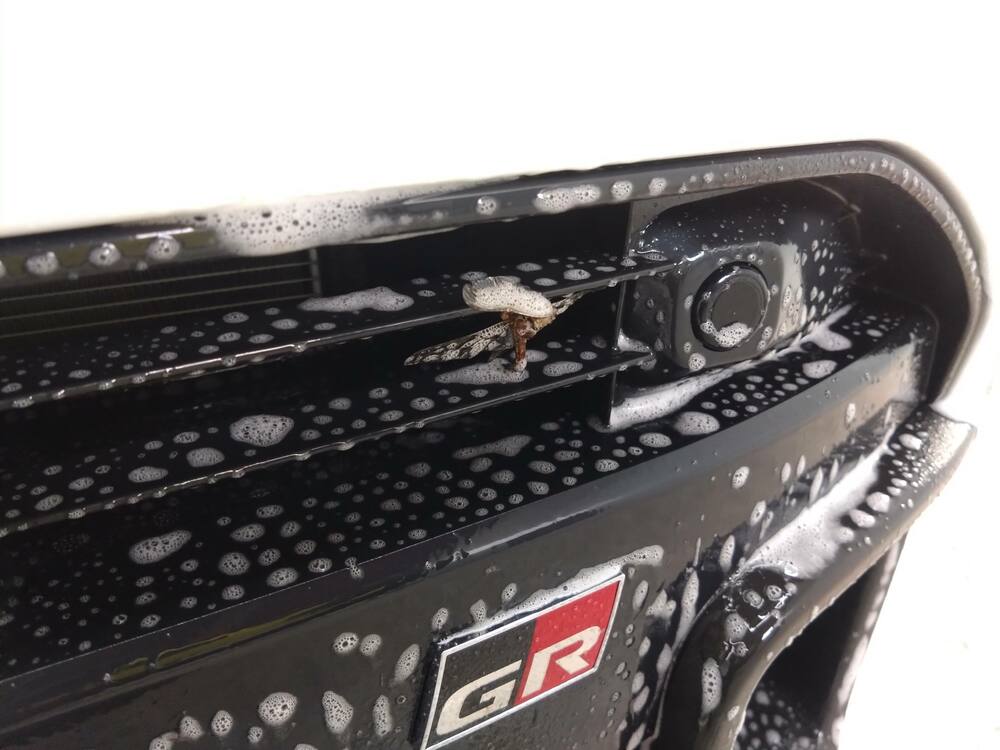 高圧洗浄機で予洗いをする前に、虫の死骸が多く付着していましたのでアルカリ洗剤を塗布しました。