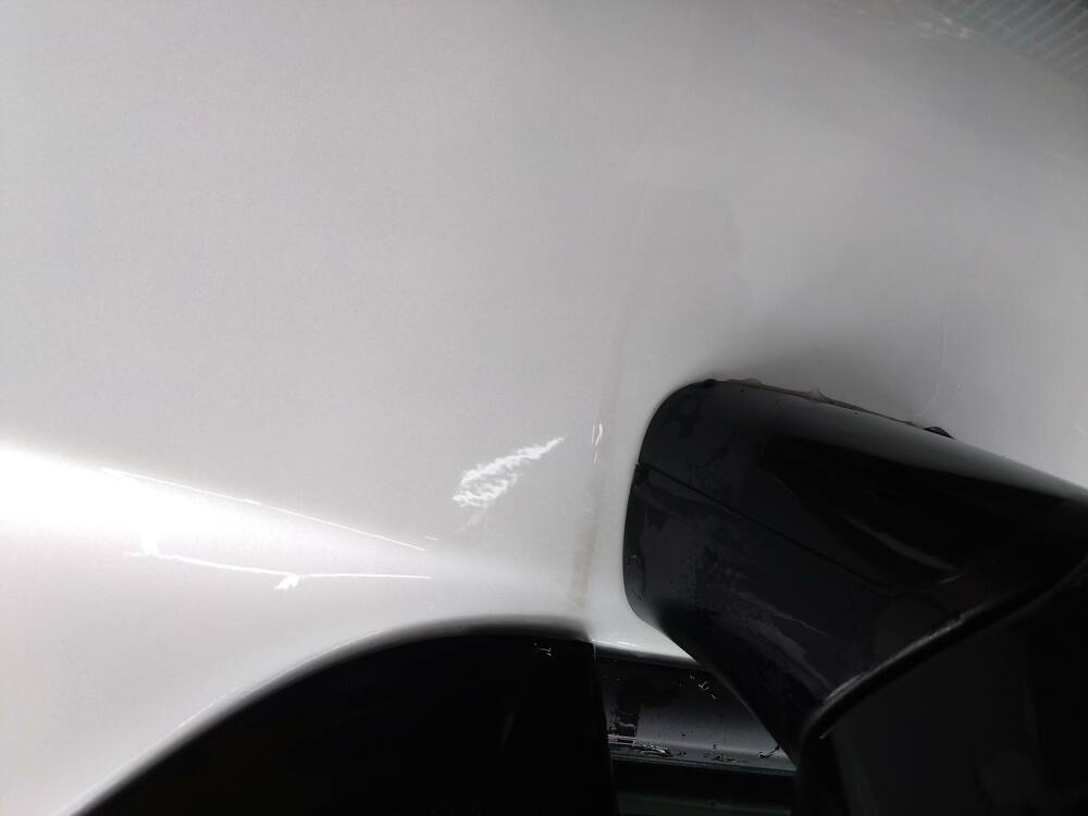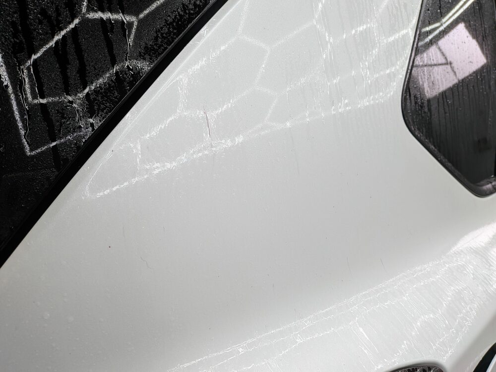 ディーラーさんでの納車から直接そのまま持ち込みいただきましたが、雨水が付着していましたのでボティの状態を確認するために雨汚れを落とすことからスタートします。