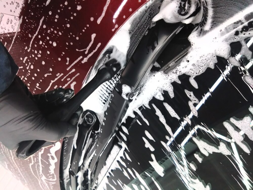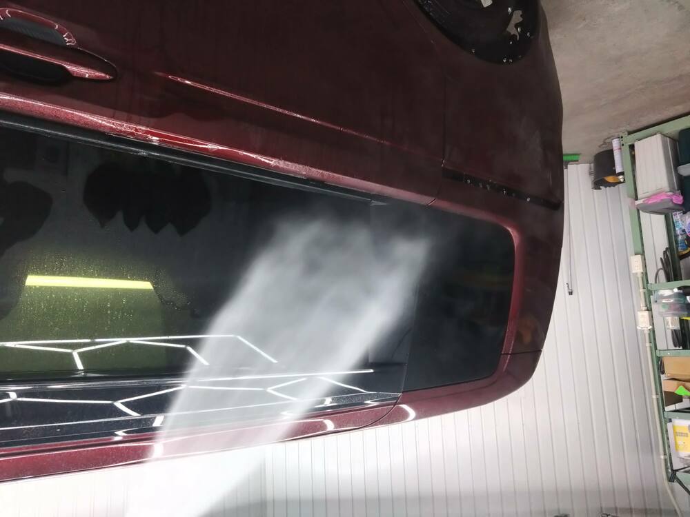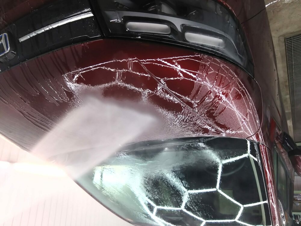 洗車を行う際に砂やほこりが残ったままだと、傷が入る原因にもなるので高圧洗浄機でしっかりと予洗いを行った後、ミット洗車を実施しました。