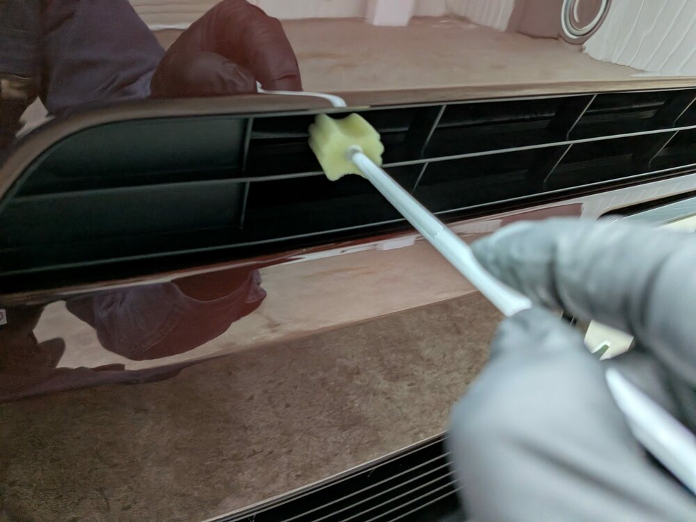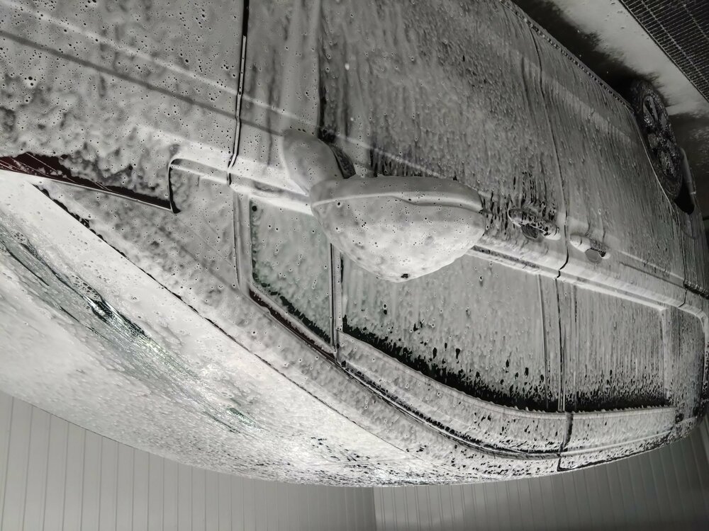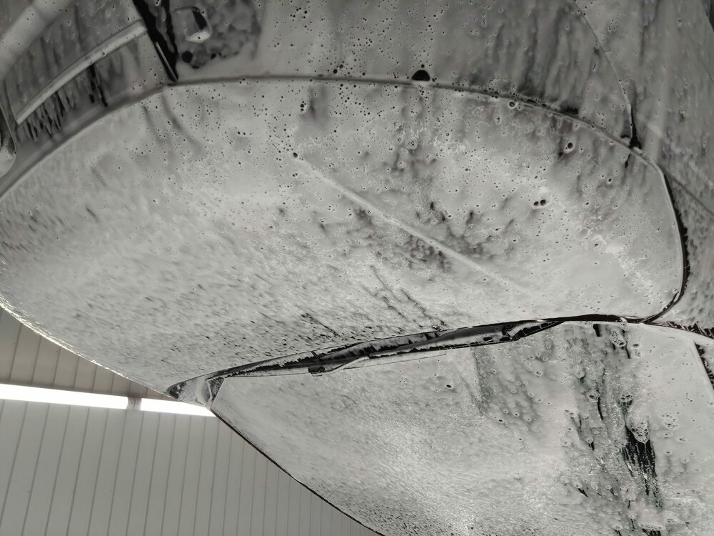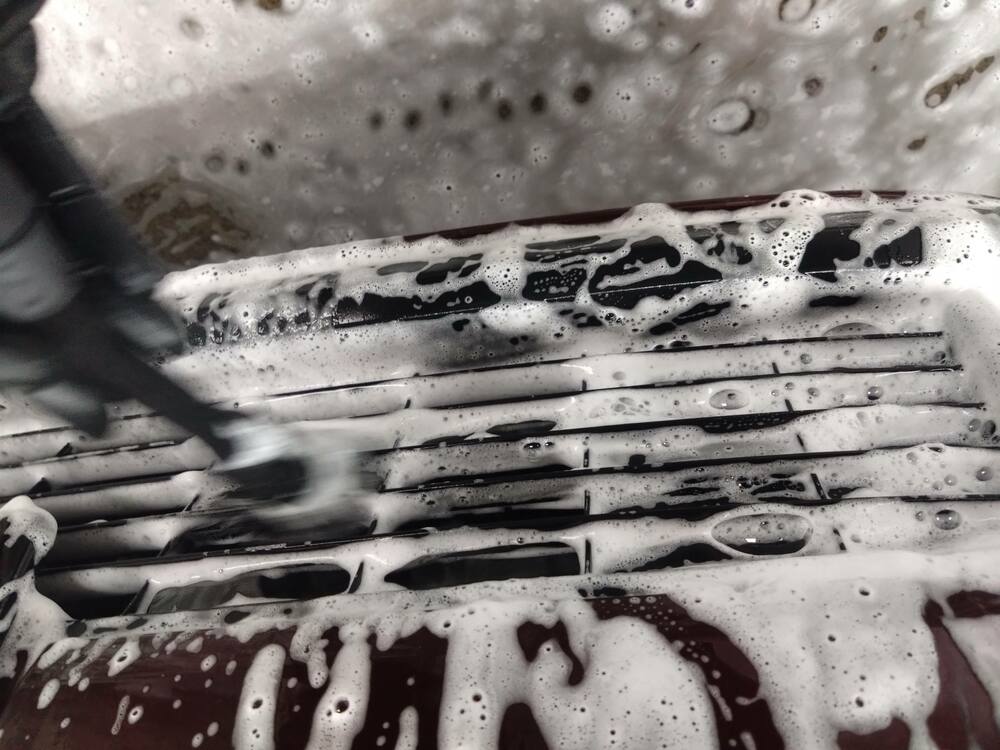 ピアノブラックの部分に傷がつかないように、フォームガンでたっぷりと泡を噴射し、摩擦を極力抑えて洗浄しています。