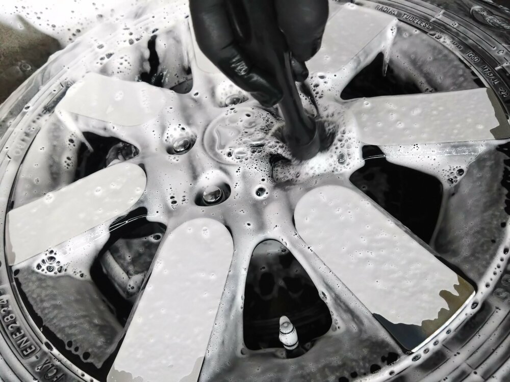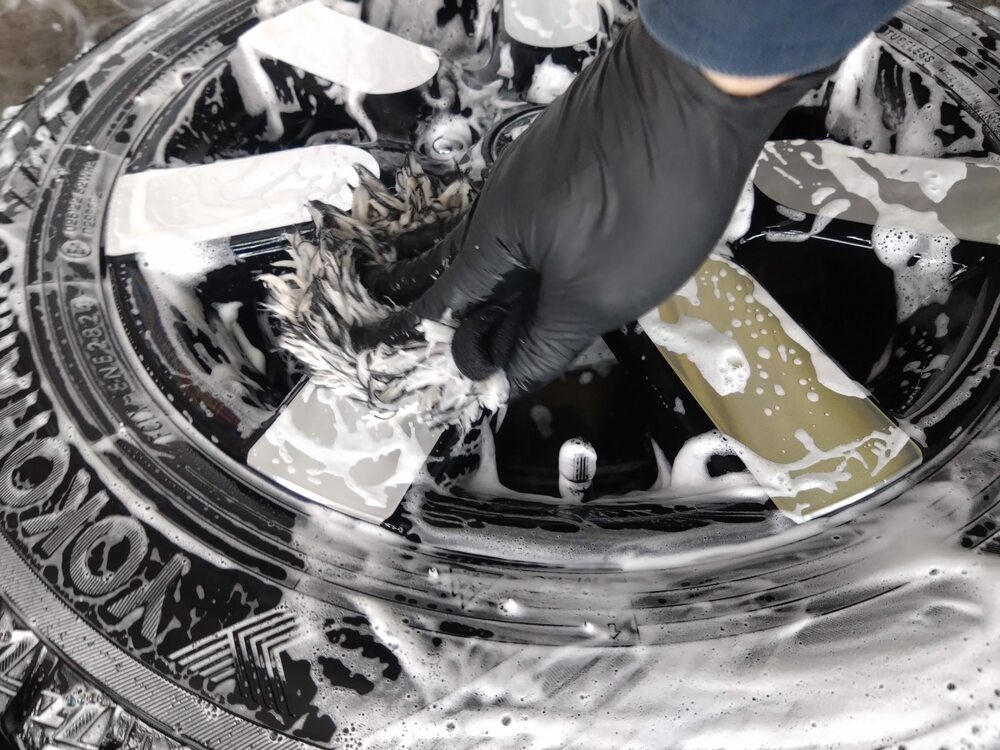 足回りにノックスドールを施工したばかりのため、高圧洗浄機を使用せずにタイヤとアルミホイールのみを慎重に作業しました。