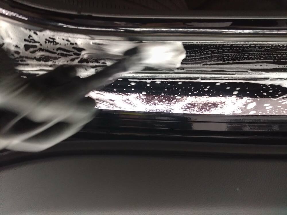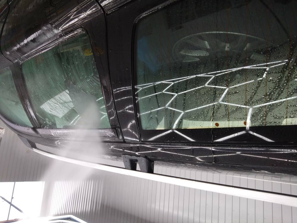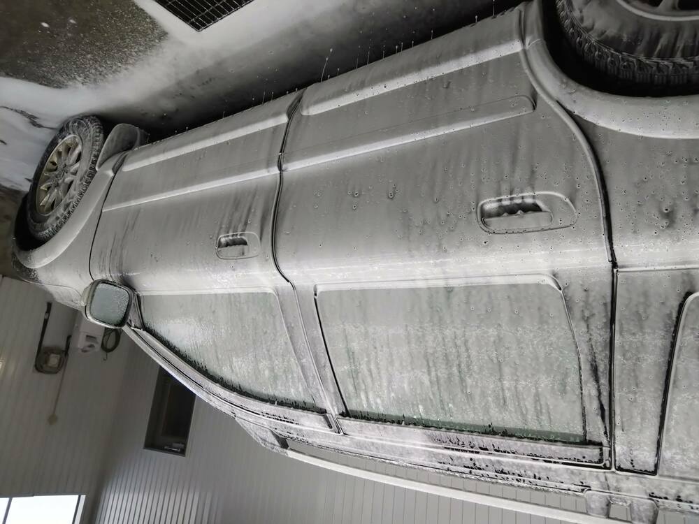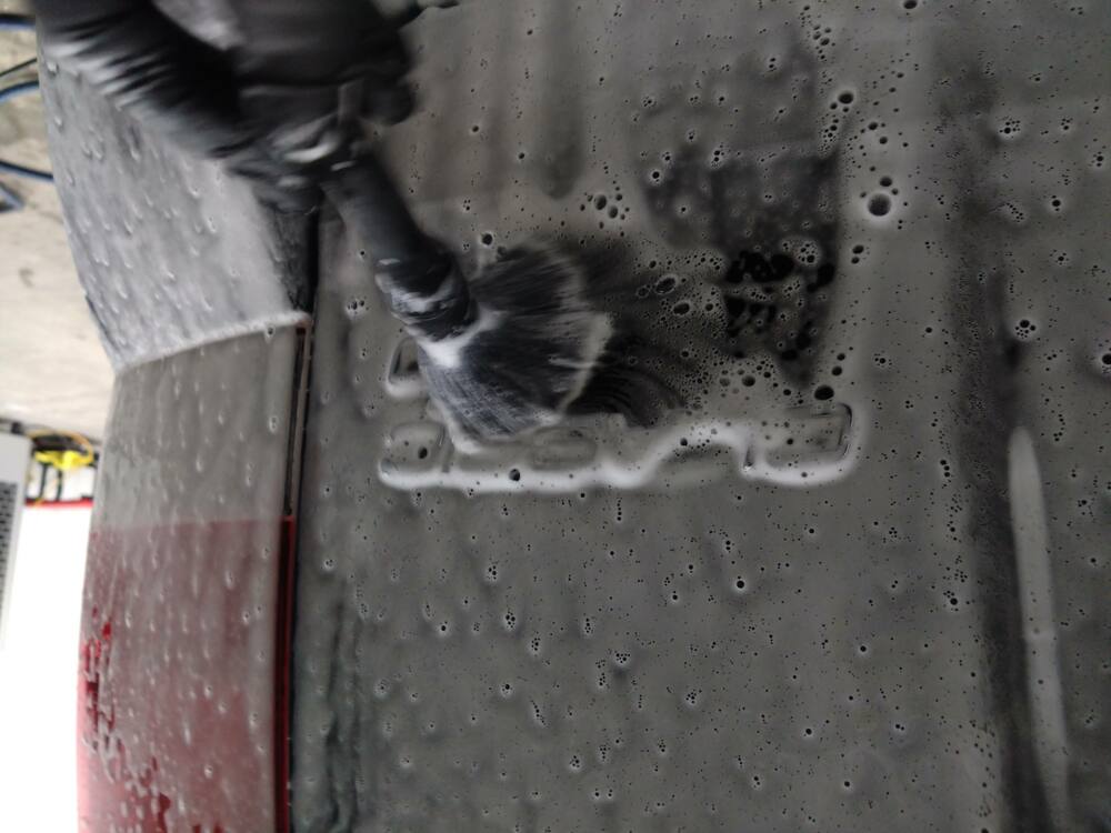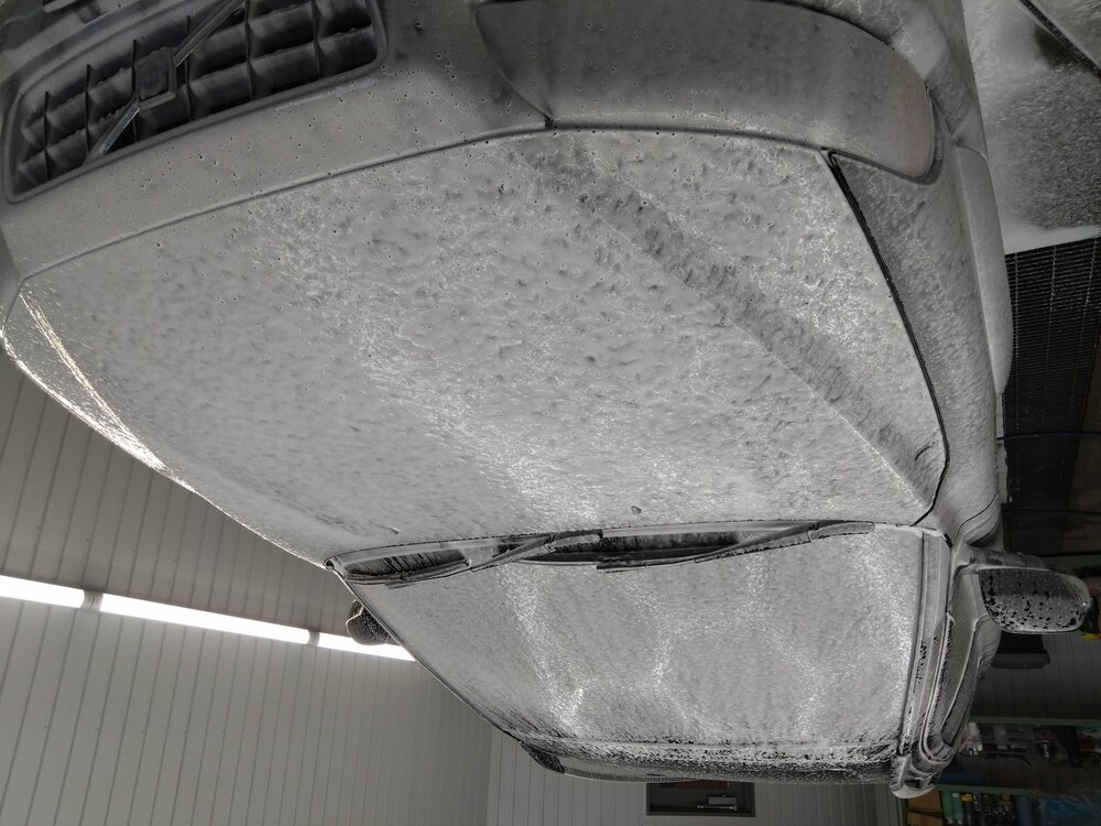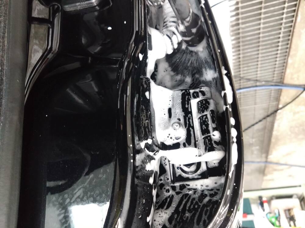 ボディに移ります。高圧洗浄機で埃や砂を落とした後、フォームガンを使用してミット洗車を行います。