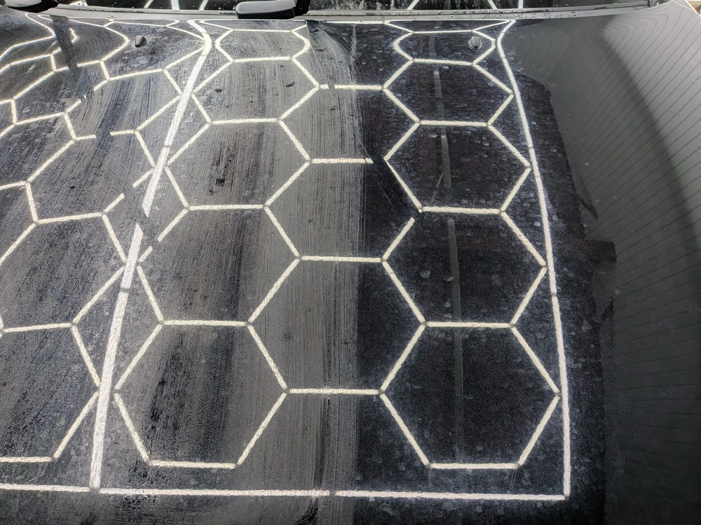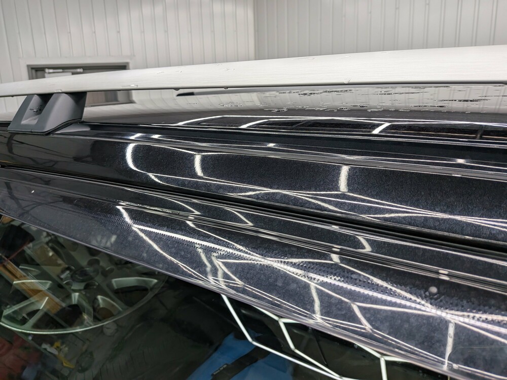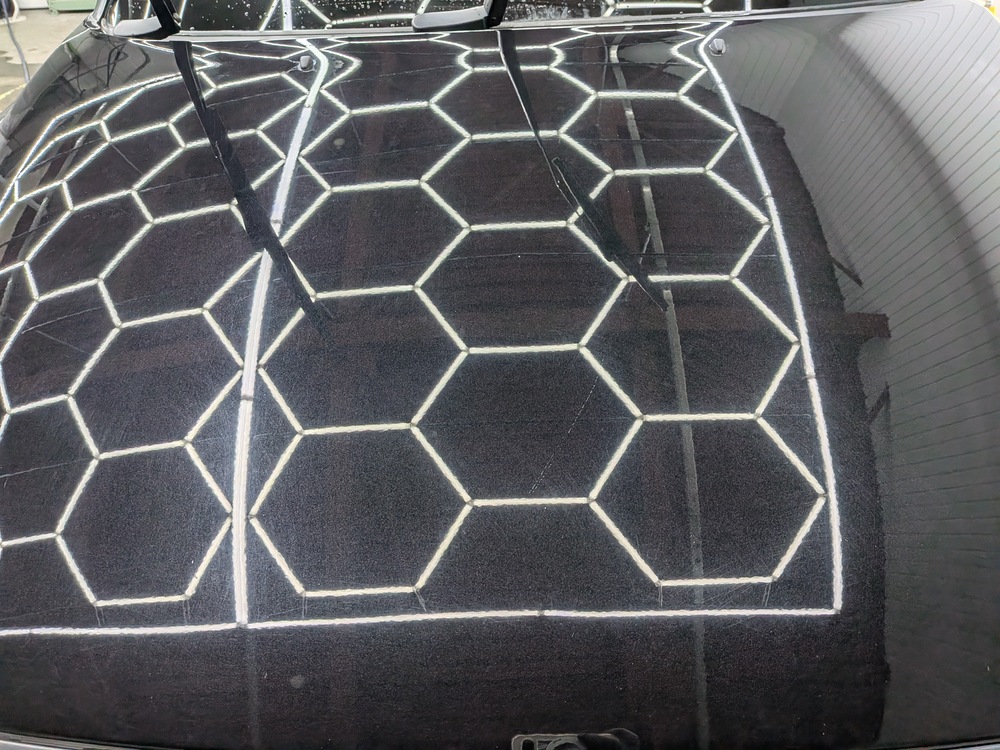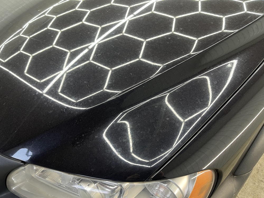シルバーコースをご用命いただきましたので、G-POWERを3回塗布し、スチームで硬化させて18層の被膜を形成いたしました。 さらに当社独自のガラスコーティング剤Micapicaを塗布することで、全19層の強固なガラス被膜が形成され、今回のお車のような濃色車では、色味に深みが増し、艶やかな輝きが際立ちます。